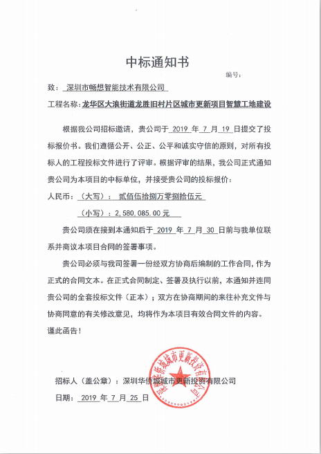 喜中深圳华侨城城市更新投资有限公司的------龙华区大浪街道龙胜旧村片区城市更新项目智慧工地建设项目,
